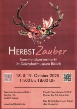 Am Wochenende Samstag & Sonntag, 18. + 19. Oktober 2025 findet jeweils 11.00 – 18.00 Uhr bei uns im und ums Museum wieder unser Kunsthandwerkermarkt „Herbst Zauber“ statt. Im Museum, aber auch auf dem umgestalteten Vorplatz und im großzügigen Innenhof kann gestöbert, bewundert und mit Kreativen aus der ganzen Region gesprochen werden. Kunsthandwerkerinnen und Kunsthandwerker präsentieren bei uns ihre aktuellen Kreationen. Für Kinder bieten wir an beiden Tagen zwischen 11.30 Uhr und 16.00 Uhr natürlich wieder eine Mitmachaktion an, dazu sind auch die Kreativstationen im Obergeschoss des Haupthauses für Kinder eingerichtet und es kann in Büchern gestöbert oder gepuzzelt werden. Und dann ist selbstverständlich auch wieder unsere Backgruppe im Einsatz. Mit ihr können kleine und große Besucher am Vormittag direkt vor Ort erleben, wie früher auf den Dörfern im Hofbackofen Brot gebacken wurde. Für das leibliches Wohl sorgen zudem auch diesmal wieder die Bislicher Vereine. Innenhof und Cafeteria bieten die Möglichkeit zum Entspannen und netten Gesprächen. Bimmelbahngeschichten, Uromas Herd, der Deichgräfeneid oder unser Eisvogel bieten dazu genügend zusätzliche Abwechslung.