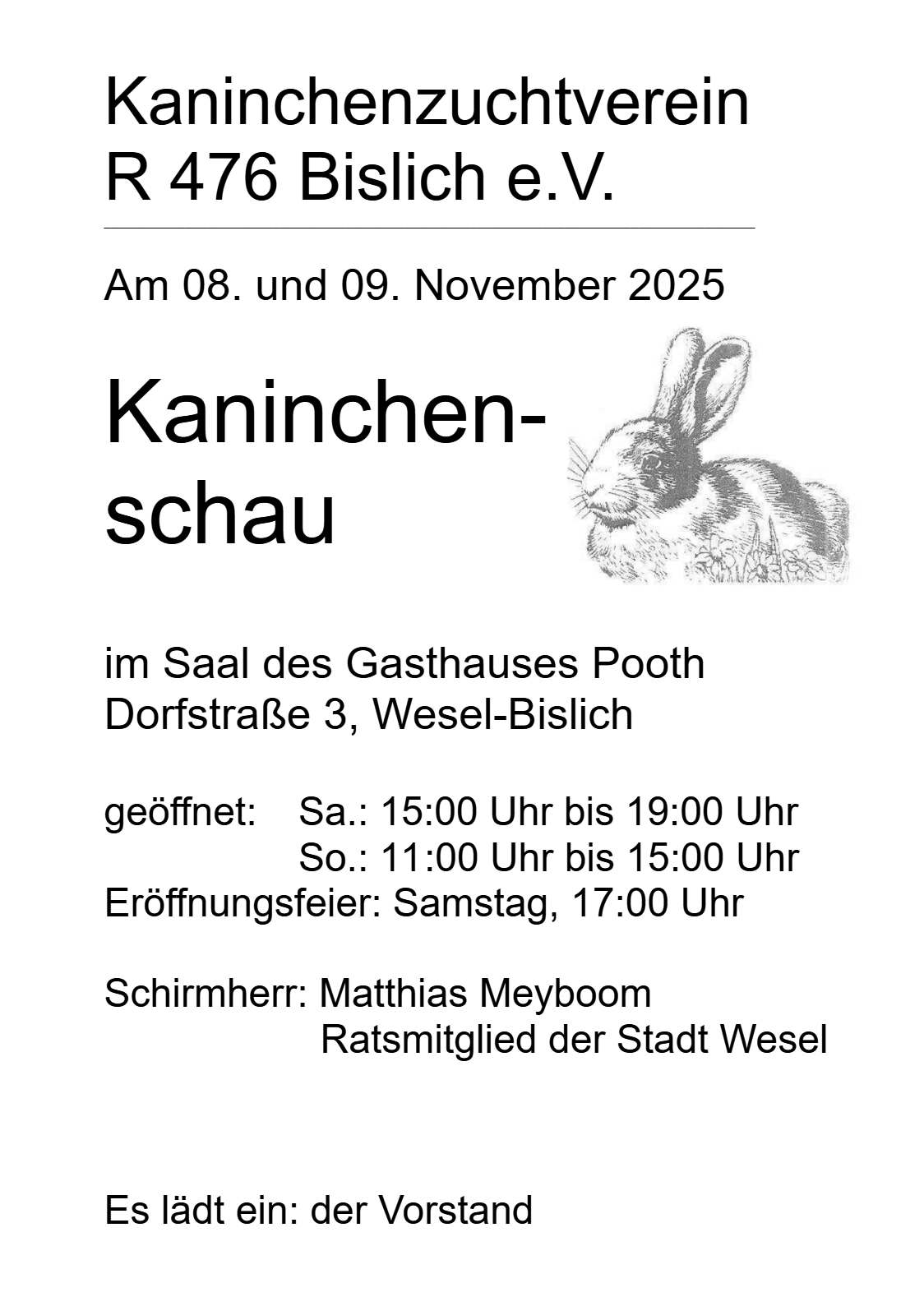 Der Kaninchen-Zuchtverein R476 Bislich e.V. führt am 08. und 09. November 2025 seine Lokalausstellung im Saal des Gasthauses Pooth, Dorfstraße 3, 46487 Wesel-Bislich, durch. Es werden ca. 100 Kaninchen aus verschiedenen Rassen und Farbenschlägen zu sehen sein.
