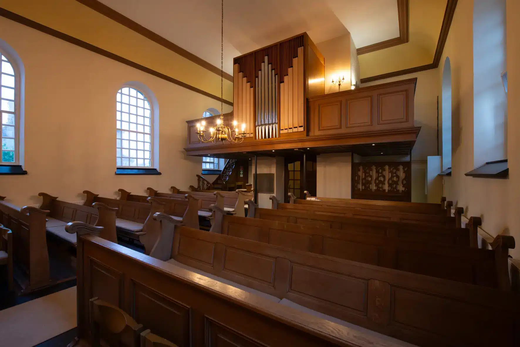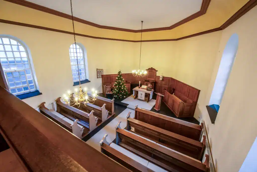 Aber der Teilzerstörung im Zweiten Weltkrieg wurde sie zwischen 1948 – 1950 in der ursprünglichen Form wieder aufgebaut. Im Innern ist die Kirche sehr schlicht gehalten.
