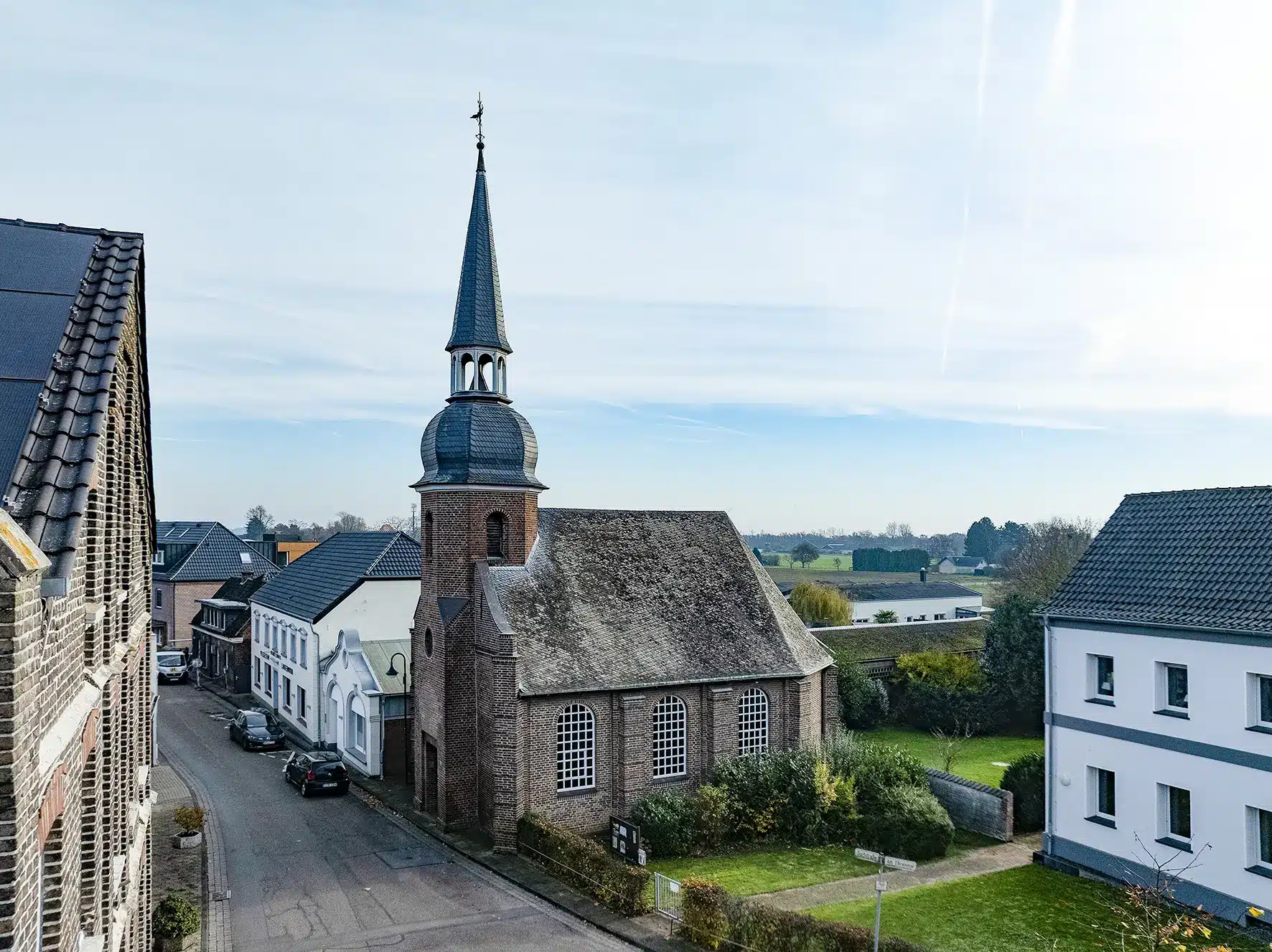 Im Dorfzentrum des ehemaligen „Kirchdorfes“, direkt an der Dorfstraße und gegenüber der Dorflinde, ist die evangelische Kirche Bislichs zu finden. Auch sie ist ein besonderes Baudenkmal, selbst wenn sie allein schon von den Größenverhältnissen her im Schatten der katholischen Kirche am Deich steht.